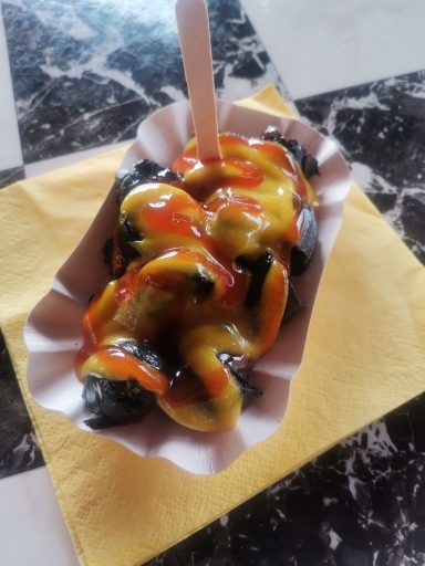 Herzhafte Schwarze Kurrywurst mit pikanter Sauce ,Currypulver und als Highlight Blattgold !!!