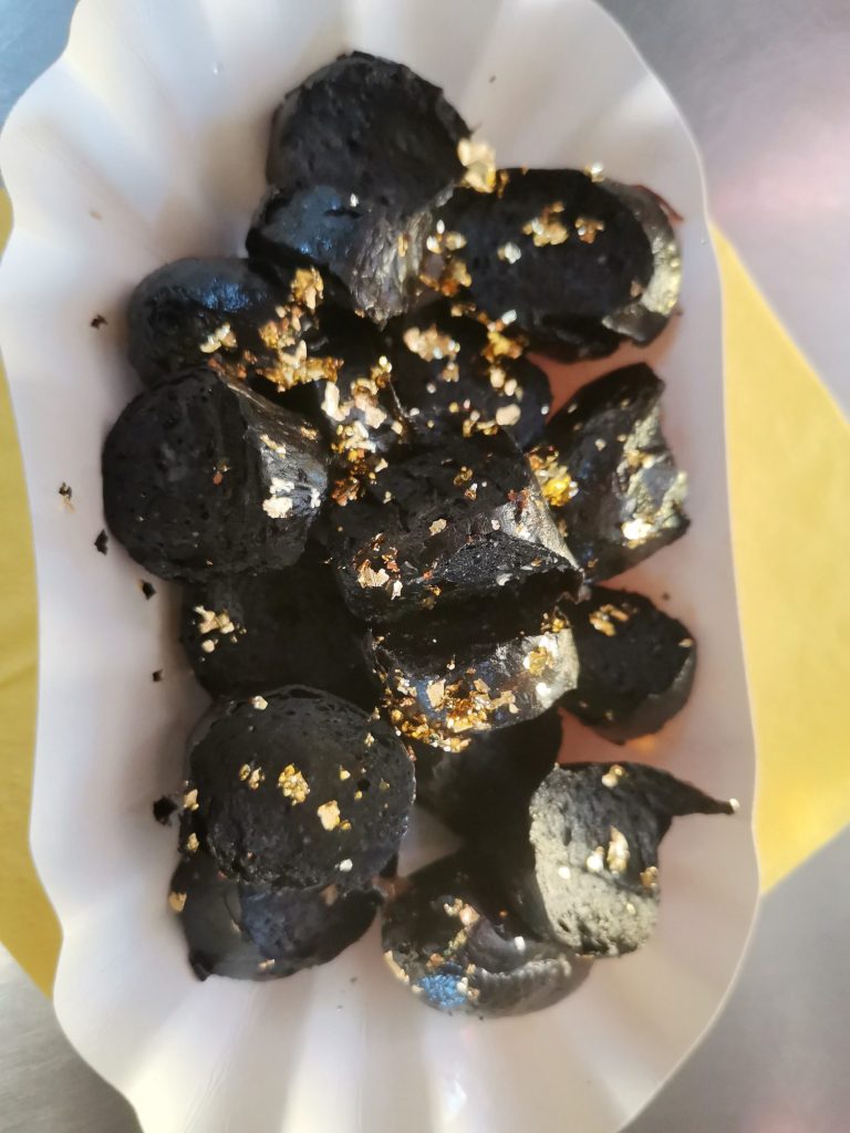 Schwarze Kurrywurst mit Blattgold